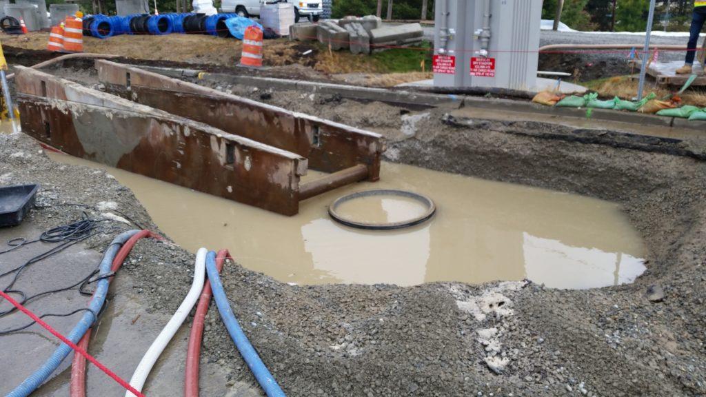 This mess was caused by a broken 16 inch waterline. Fortunately, all of the muddy water was contained in a 72″ storm pipe with a valve. Water was then pumped to a Chitosan-enhanced Sand Filtration (CESF) system for treatment to 5 NTUs for discharge to a creek. Knowing this project was going to be constructed over several winter seasons, we specified the CESF system in the contract. Always Be Prepared!