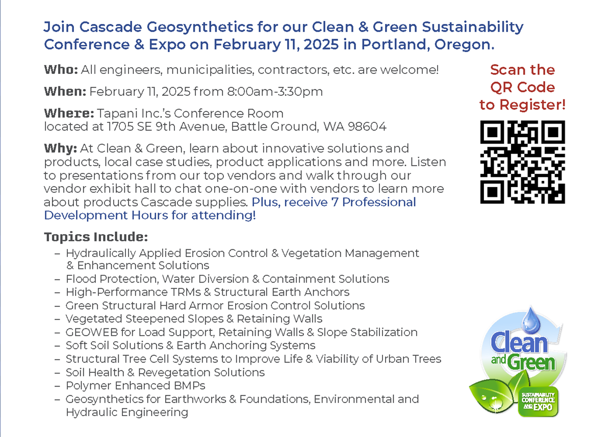 You're invited to Cascade Geosynthetics' 2025 Portland Clean & Green on February 11th. Bill Murphy, P.E. will be the host with a great lineup of presentations covering a mix of local case studies, geosynthetics, erosion control & stormwater management solutions. In addition to presentations, there will be time for attendees to mingle with each other and visit vendor booths to chat one-on-one with our vendors' technical representatives and learn more about different products and solutions.